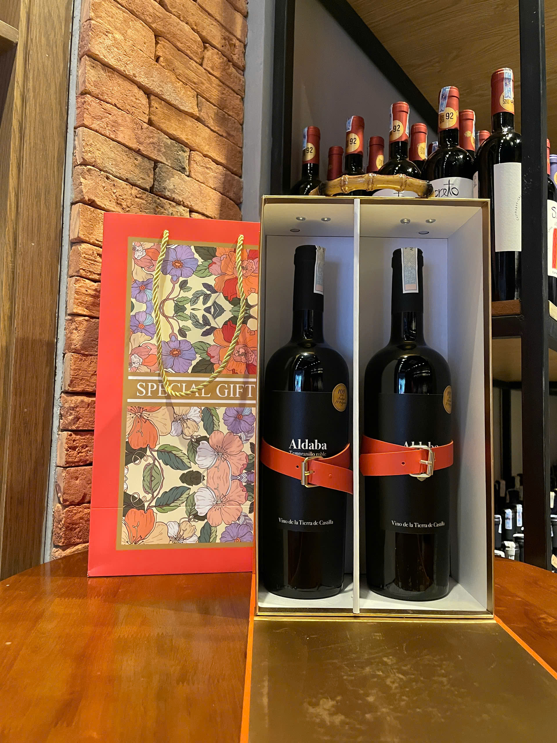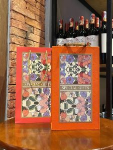 Hộp nhung đôi cam đựng được 2 chai rượu có tay cầm, tặng kèm túi giấy.