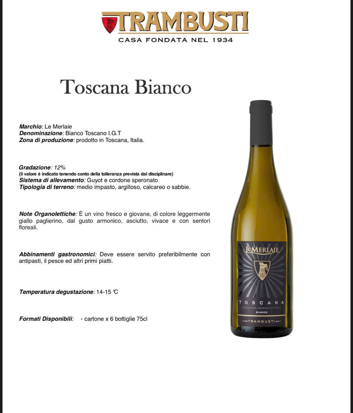 Le Merlaie Toscana Bianco IGT của nhà làm vang Trambusti là một chai vang trắng mang phong cách tươi trẻ, thanh thoát đặc trưng của vùng Tuscany, Ý. Được làm chủ yếu từ giống nho Trebbiano kết hợp một phần nhỏ Chardonnay, chai vang này mang đến trải nghiệm nhẹ nhàng, dễ uống và cực kỳ phù hợp cho những bữa ăn hải sản hay các buổi gặp gỡ thư giãn.
